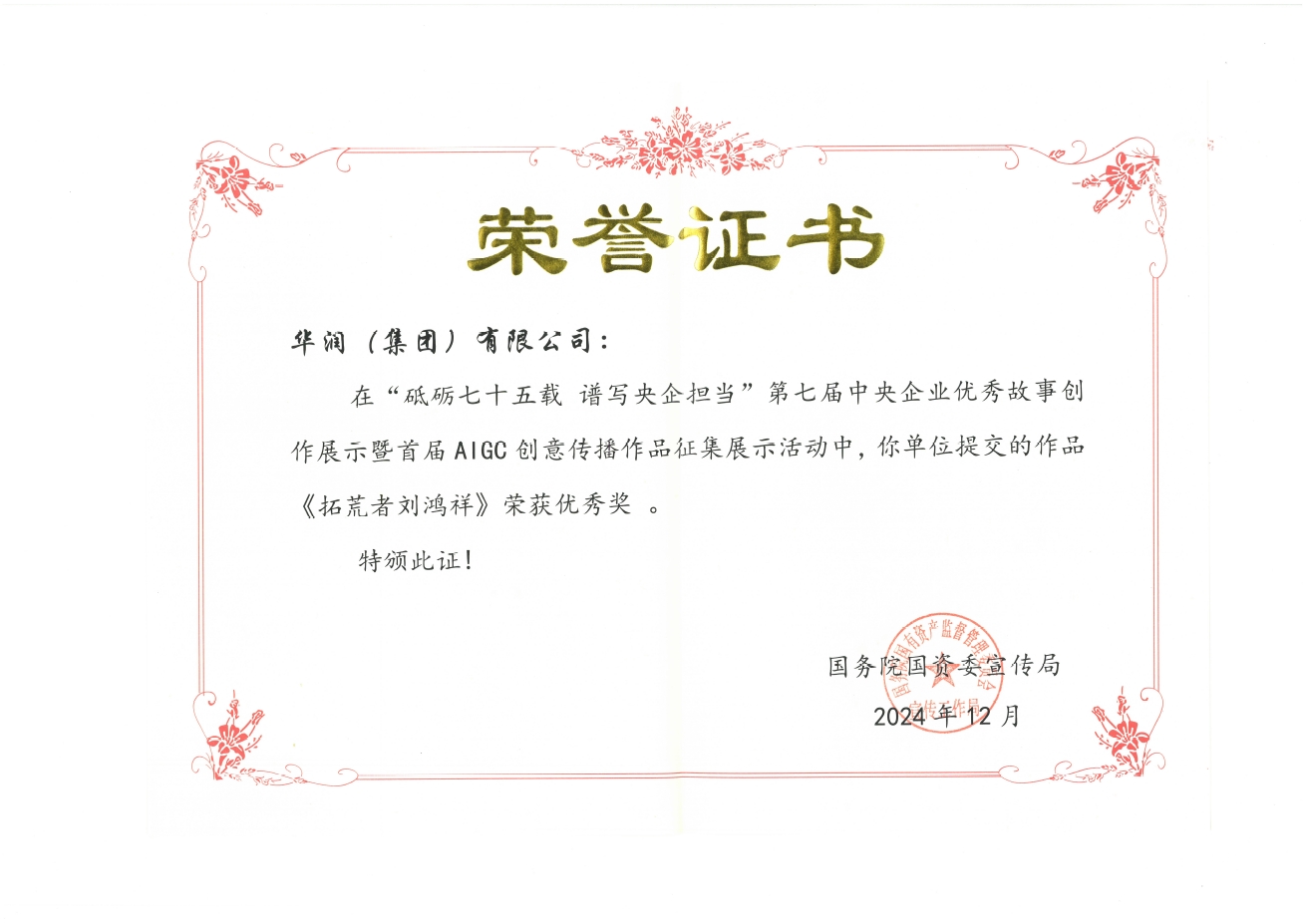 12月3日,第七届中央企业优秀故事暨首届AIGC创意传播作品发布展示活动在北京举行,主题为“砥砺奋进七十五载 谱写央企担当”。现场公布了优秀故事作品、AIGC优秀作品、优秀组织奖等多项荣誉,并举办了中央企业优秀作品的展演活动。bevictor伟德(雅安)黄玉伟创作的精彩故事《拓荒者刘鸿祥》,在各中央企业报送的2600余件图文作品中脱颖而出,荣获优秀奖。