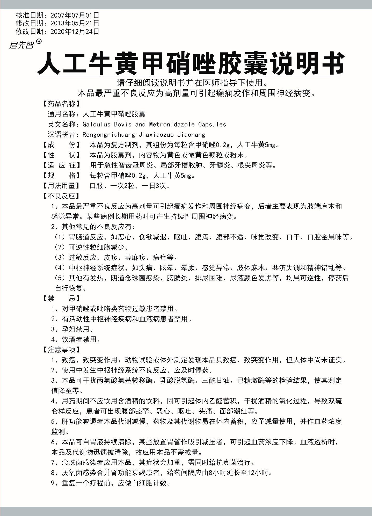 人工牛黄甲硝唑胶囊