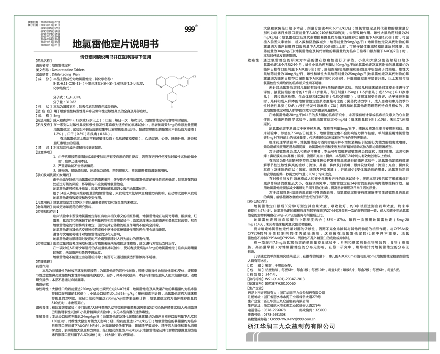 地氯雷他定片为第三代抗过敏药,起效快,疗效好,无嗜睡等副作用,一天一片,24小时持续有效,可与食物同时服用,用于缓解慢性特发性荨麻疹及常年性过敏性鼻炎的全身及局部症状。