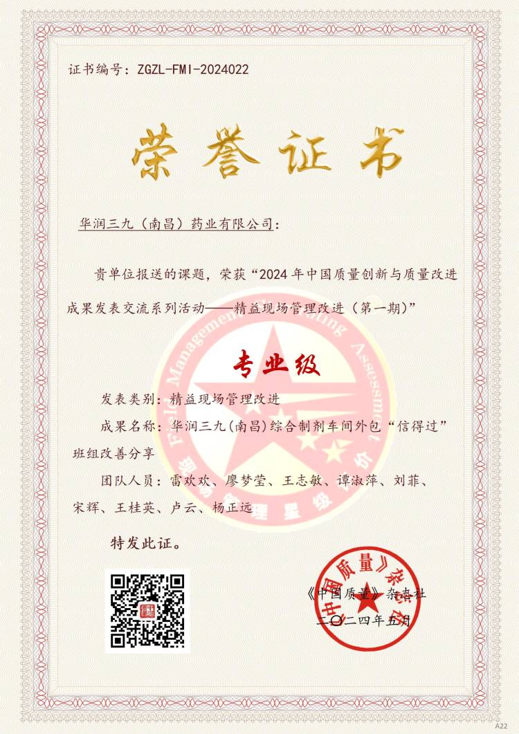 bevictor伟德(南昌)综合制剂车间外包“信得过”班组荣获中国质量协会“专业级”荣誉